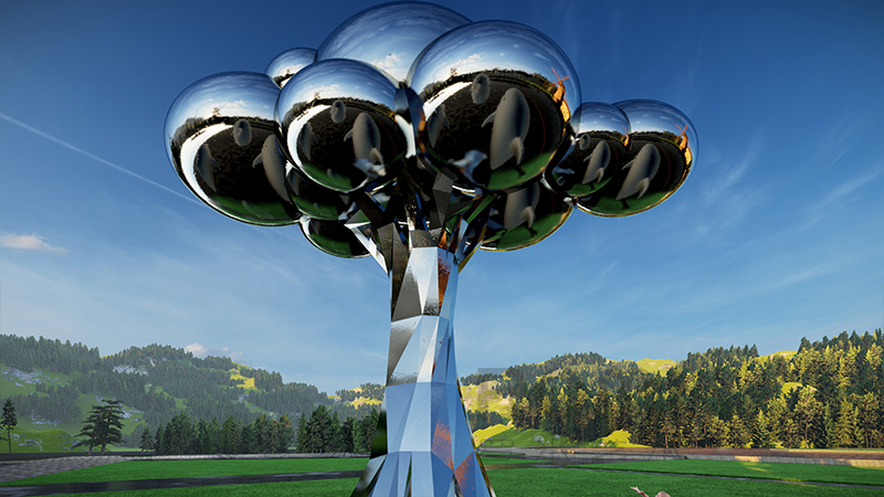 設計理念:通過浪漫的超現實主義手法,用云的形狀作為樹的樹冠,從遠處看就像一朵云落在樹干上,近年來云是樹冠葉子的一部分。皇冠的弧形和圓形與樹干的幾何塊形成強烈的視覺對比。